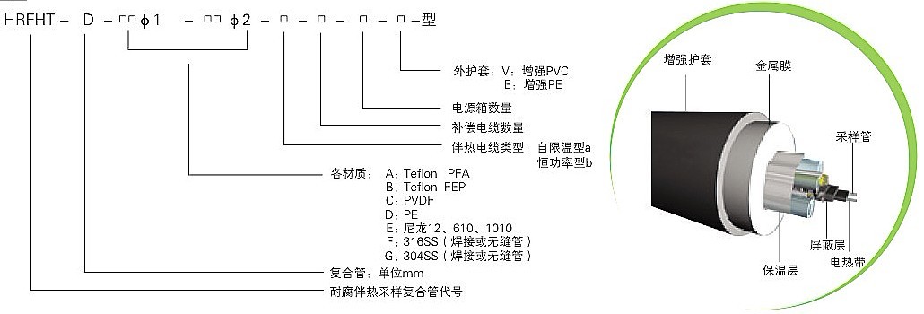 耐腐采樣伴熱復(fù)合管是環(huán)保監(jiān)測(cè)系統(tǒng)中的重要部件,它是由一組耐腐高性能樹脂導(dǎo)管輔以自限溫伴熱帶以及補(bǔ)償線纜組成內(nèi)芯,外加保溫層,最后敷以阻燃聚乙烯(PE)保護(hù)外套復(fù)合而成。自限溫伴熱帶的自動(dòng)限溫功能,可以保證采樣管內(nèi)維持一定的溫度,從而盡可能保證采集樣品與初始值保持一致,最終確保環(huán)保監(jiān)測(cè)系統(tǒng)連續(xù)、正確地采集樣氣。根據(jù)采集樣氣的成份、溫度等實(shí)際情況,耐腐伴熱采樣復(fù)合管中采樣導(dǎo)管可以選用不同的材質(zhì),如PFA(四氟乙烯與全氟烷基醚共聚物)、FEP(四氟乙烯和六氟丙烯共聚物)、PVDF(聚偏二氟乙烯)、PE(阻燃聚乙烯)、尼龍610等等, 伴熱帶可以選用中、低、高溫度伴熱帶,另外還可以根據(jù)用戶要求添加補(bǔ)償導(dǎo)線、電源線等 。