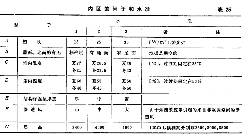在表11中給出全年負(fù)荷計(jì)算方法的種類。在略算法中,根據(jù)實(shí)驗(yàn)設(shè)計(jì)法利用推斷表的方法,是在對(duì)負(fù)荷的大小有影響的因素(例如窗面積比)的幾個(gè)水準(zhǔn)(例如20%, 40%,60%三個(gè)水準(zhǔn))中選出一個(gè),只要用簡(jiǎn)單的加減運(yùn)算便可求出負(fù)荷某種程度的增加或減少,因而是非常便利的。這里給出的是由日本建筑學(xué)會(huì)節(jié)能小委員會(huì)作成的表。