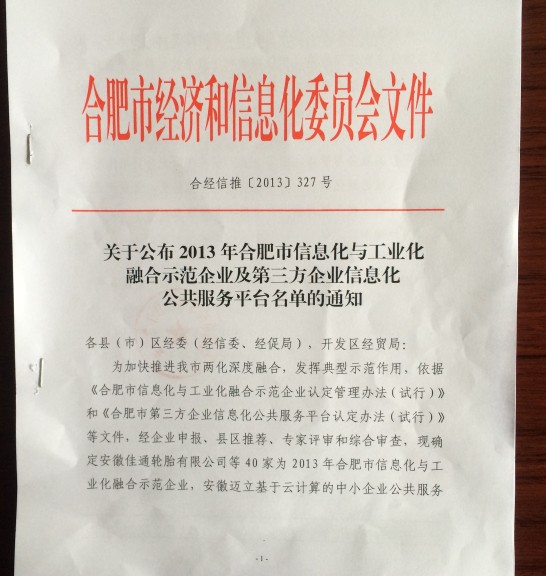 以下為合肥市經濟和信息化委員會頒發證書及紅頭文件: