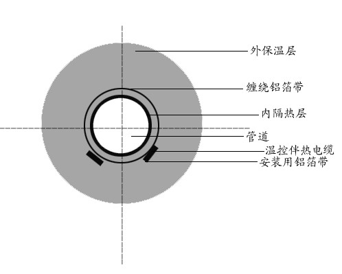 由于蒸汽掃線時間相對較短。一般控制在30分鐘左右??刹捎孟聢D雙層保溫結構來保證使用。一般來說,這種結構的內層保溫厚度為5-10mm.在內保溫層外加包鋁膠帶,鋁膠帶上敷設自控溫電熱帶。每毫米內層保溫層可使掃線溫度減低10℃左右,或采用隔離支架,每米1—2只,效果也較理想。當然,在掃線時必須停止通電,管線熱損失仍按常規設計,保溫層厚度只能按外層為計算厚度。