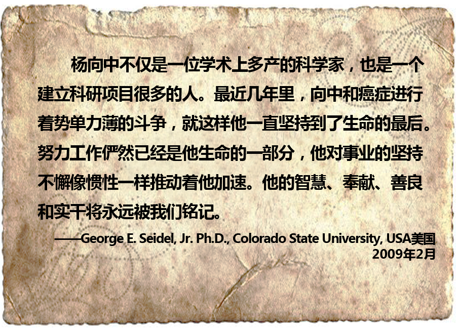 楊向中博士的一生雖然短暫,但是沾溉后人的事跡很多,成就也很多,寫不勝寫。今天,我們僅以這篇小小的微信文章紀(jì)念向中公司的創(chuàng)立者逝世9周年,緬懷之余,也希望不僅有美國人還有更多的中國人記住他的名字——著名華裔科學(xué)家世界“克隆牛之父”楊向中!