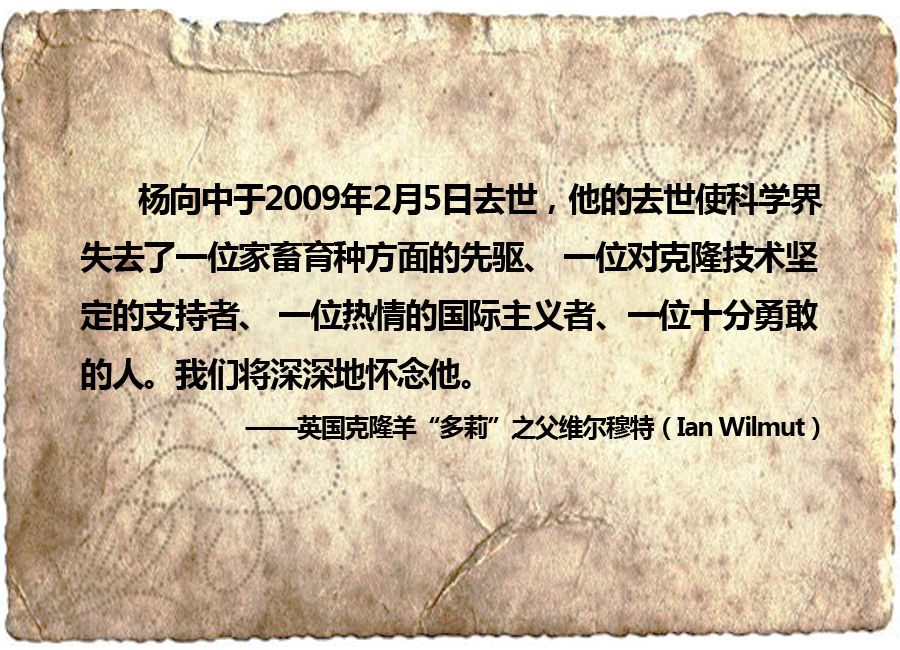 楊向中曾說這段經(jīng)歷為他今后走入科學(xué)殿堂作了鋪墊。他酷愛動物培育技術(shù)研究,“赤腳獸醫(yī)”的經(jīng)歷進(jìn)一步增加了他對這門學(xué)科的熱愛,沒有這些經(jīng)歷就沒有他后來的克隆研究成就。