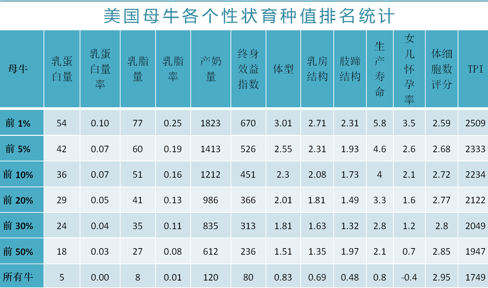 其次,你需要清楚地知道每一頭牛的生產性狀育種值(產奶量、乳蛋白量、乳脂量)、健康性狀育種值(生產壽命、女兒懷孕率、體細胞數評分)以及體型性狀育種值(體型、乳房結構、肢蹄結構)。下表為美國荷斯坦協會在2018年4月公布的美國牛群各性狀的育種值。你了解到你的牛群存在的差距了嗎?