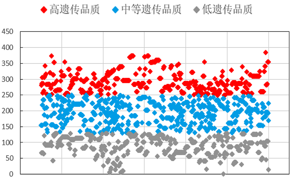 另一方面,在牧場規模較小的時候,飼養400頭犢牛和飼養300頭犢牛在管理上的挑戰較小,但是對于大型牧場來說,飼養3000頭犢牛和飼養2000頭犢牛有著本質的區別,對牧場的管理要求更高。這種情況下牧場又該怎么制定育種規劃呢?同樣利用優選軟件也可以知道牧場全群牛的遺傳品質。下圖是牧場牛群遺傳品質分布圖。牧場中永遠都是高遺傳品質和低遺傳品質的牛各占一部分,大部分牛都屬于中等遺傳品質。那么,牧場是否可以選擇牛群中的某一部分牛生產下一代呢?