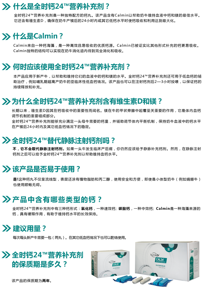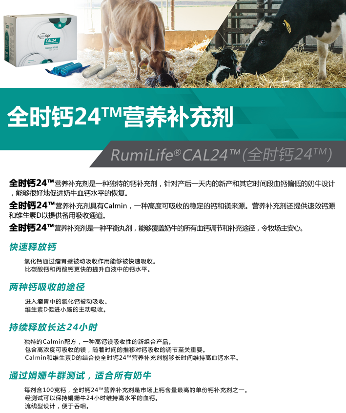 全時鈣24?營養補充劑是一款與眾不同的鈣劑產品。每劑含100g鈣,是鈣含量非常高的產品。包含有快速釋放型鈣——氯化鈣,能夠迅速被瘤胃壁吸收。另一部分組分是Calmin,是一種易吸收的鈣鎂化合物,對于鈣的吸收調節有著重要的促進作用。再加上能夠促進小腸對鈣主動轉運的維生素D,使得全時鈣24?能夠在相當長的時間內給奶牛不斷提供充足的血鈣。通過這些獨特的組分,全時鈣24?能夠給新產牛或其它缺鈣奶牛提供長達24小時的充足血鈣補給。