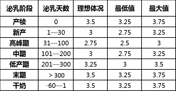 根據(jù)以上情況,賓州大學(xué)對泌乳牛各階段的體況評分推薦情況如下: